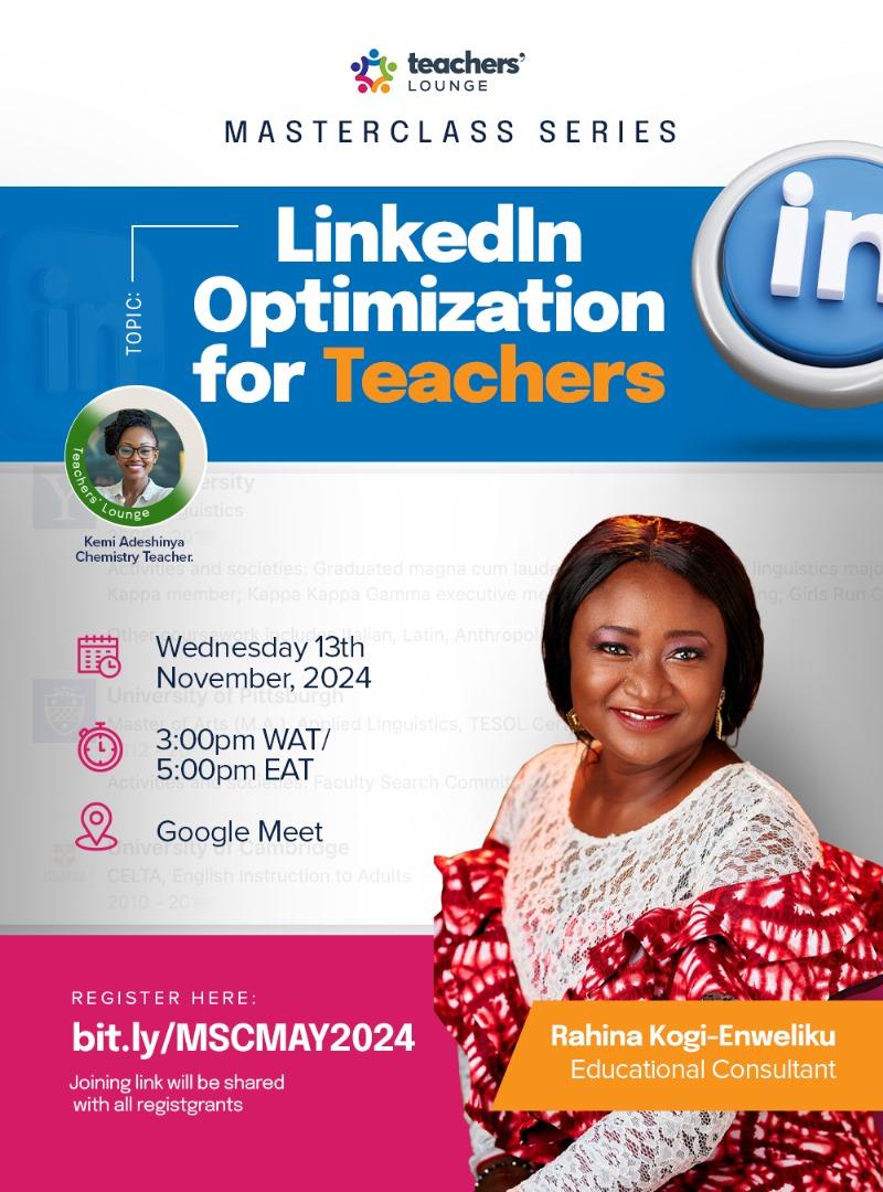 The Teachers Lounge held an insightful Masterclass Session on the 14th of November 2024 with 150 participants. The session’s topic was on LinkedIn Optimization: Maximizing LinkedIn for Educators for Teachers handled by a LinkedIn expert and teacher Mrs Rahina Kogi-Enweliku,.