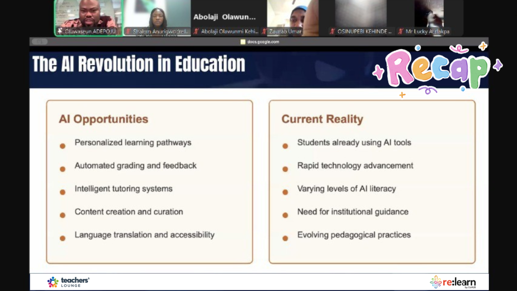 The session brought together 110 teachers, online tutors, school leaders and administrators from Nigerian, Kenya and the United States to explore how AI can transform educational practices.
